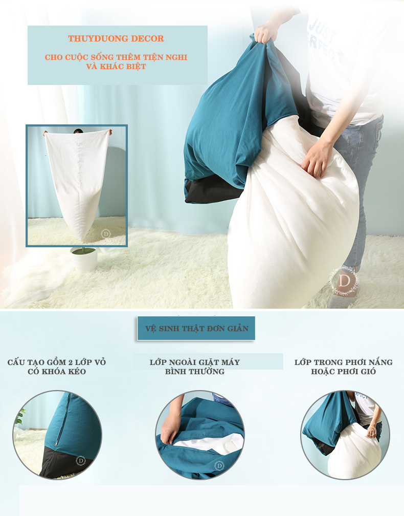Lớp vỏ lót bên trong chứa hạt xốp, sau khi gaiwtj lớp ngoài lớp trong này có thể phơi nắng hoặc phơi gió để sạch vi khuẩn.